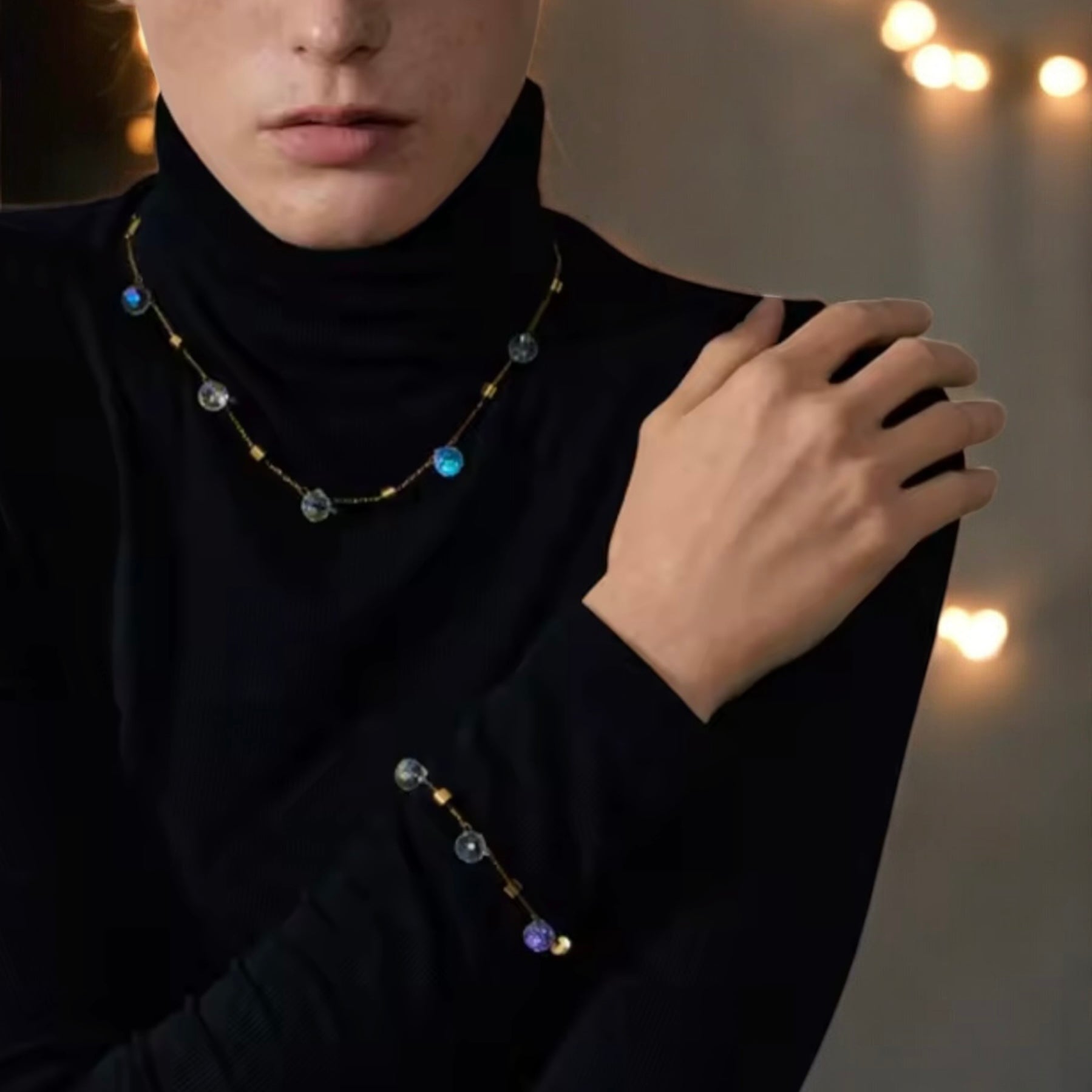 - Detalles luminosos: Esferas facetadas que capturan la luz con sutileza.