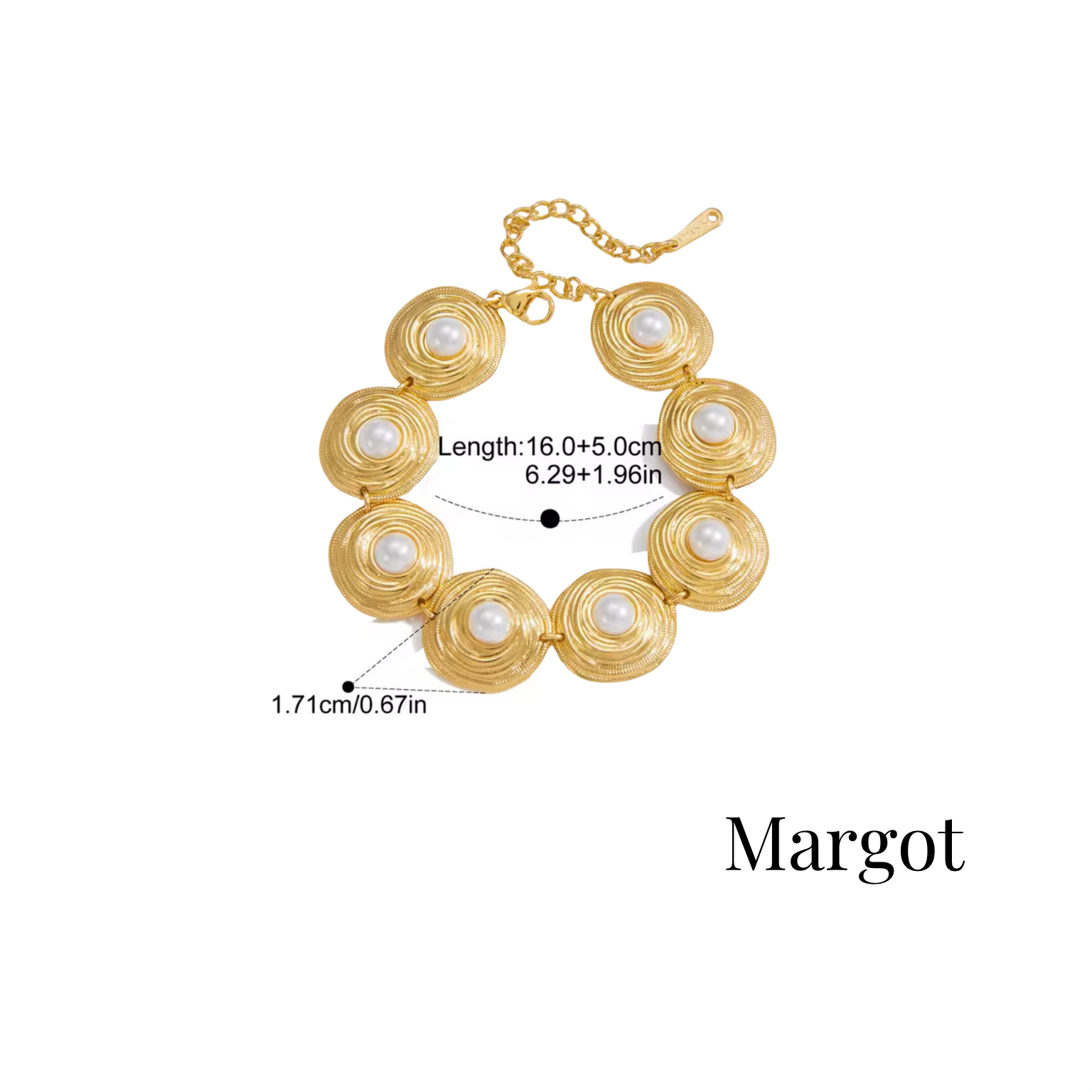 El Margot Bracelet de Brille Éternel es unajoya que combina sofisticación y modernidad en un diseño atemporal. Elaborado en acero inoxidable con baño en oro 18K, presenta eslabones circulares texturizados que enmarcan delicadas perlas, creando un contraste elegante y femenino. Su cierre tipo lobster ajustable garantiza comodidad y adaptabilidad, mientras que su acabado hipoalergénico y waterproof asegura durabilidad sin perder brillo ni estilo. Perfecto para mujeres que buscan un accesorio versátil que complemente tanto un look diario como un atuendo de noche. Comprar ahora y añade a tu colección un brazalete que refleja lujo minimalista y distinción.